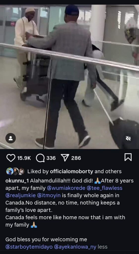 Expressing gratitude to God for the reunion, Okunnu said he had spent 8 years apart from his family, and they are finally whole again. He stated that no distance, time, or nothing keeps a family’s love apart.