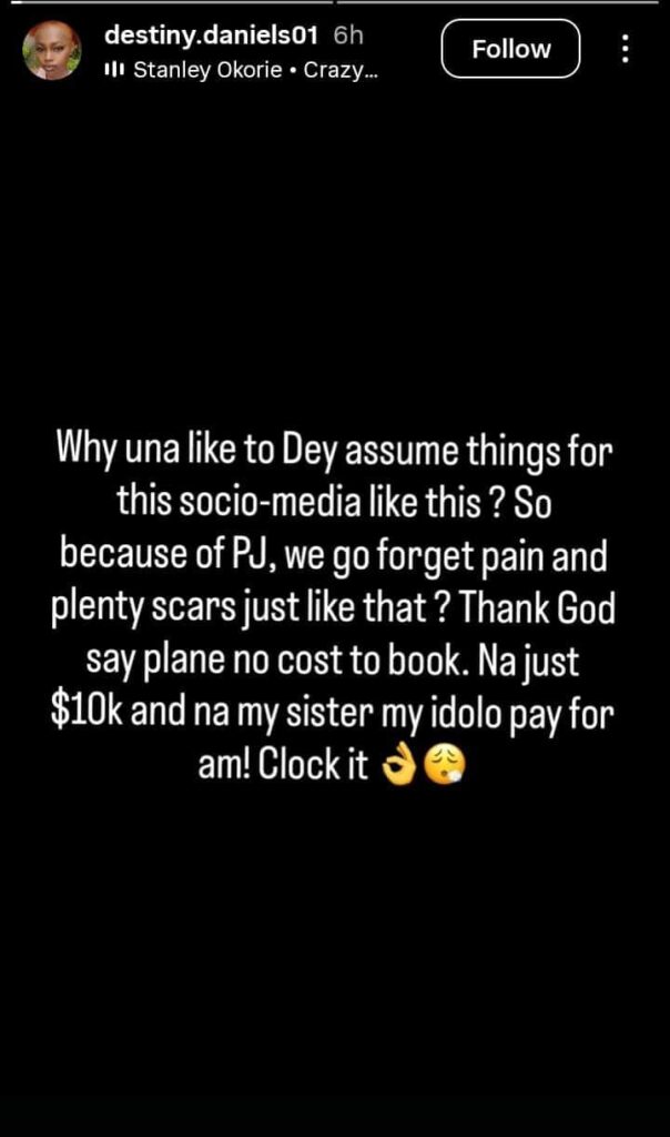 “Why una like to dey assume things for this socio-media like this? So because of PJ, we go forget pain and plenty of scars just like that? Thank God sey plane no cost to book. Na just $10k and na my sister, my idolo, pay for am! Clock it”.