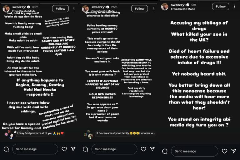 In a series of Instagram stories, he told the public to hold Ned Nwoko responsible if anything happens to Regina, their brother Sammy and younger sister Destiny. He said he had never seen an in-law sue a wife and the wife’s siblings.