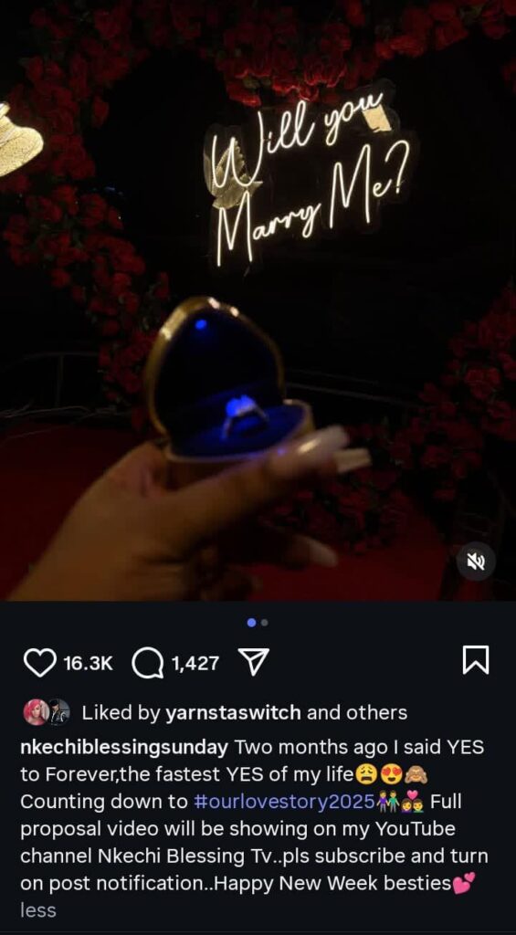 On her Instagram page, she shared photos of herself flaunting a ring, revealing that two months ago, she said ‘yes to forever. According to Nkechi, it was the fastest yes of her life.