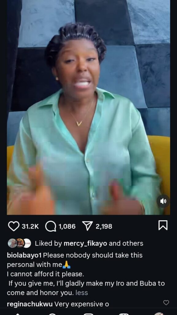 In a video posted on her Instagram page, the Yoruba actress revealed that she has 8 Owambes before the end of the year, and it is approximately N2 million. She said she can’t afford it, as she noted that buying asoebi comes with additional expenses and the extra costs she has to incur at events.