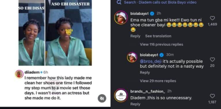 Commenting under the post, Diiadem recounted how, when she was much younger, she followed her stepmother to a movie set, and Biola, who was present, allegedly asked her to clean her shoes on set.