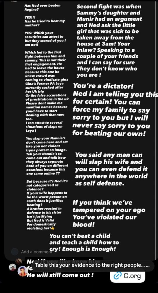 Sweezy claimed that the nannies have intervened to separate the fight between Regina and Ned on several occasions. He recounted the incident when Ned kicked his niece out of the house at 3 a.m. because she had got into a fight with his son, Munir.